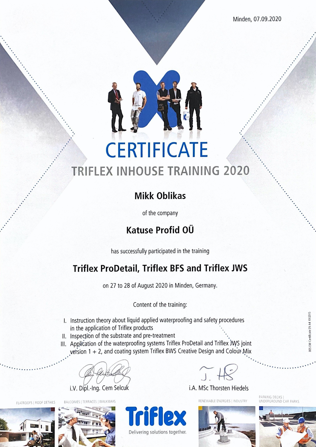 Triflex GmbH & Co.KG:n tehdas sijaitsee Mindenissä Saksassa ja on Folmann GmbH & Co.KG:n tytäryhtiö, joka valmistaa erilaisia teollisuudessa käytettäviä erikoiskemikaaleja, kuten liimoja ja musteita. PMMA-teknologian edelläkävijänä ja Euroopan johtavana nestevesieristyksen asiantuntijana se tarjoaa pitkälle kehitettyjä ja kestäviä ratkaisuja vaativiin ympäristöihin, kuten vesikattoihin, terasseihin, parvekkeisiin, parkkihalliin ja erilaisiin opastejärjestelmiin teilla, pysäköintialueille ja lentokentille. Vedeneristys- ja pinnoitusjärjestelmät sisältävät monia komponentteja, jotka täyttävät tiukat vaatimukset ja ovat keskenään yhteensopivia ratkaisemaan erilaisia ongelmia.Vuodesta 2017 lähtien olemme olleet Triflexin tehtaan yhteistyökumppani. Tämä aikana olemme jatkuvasti parantaneet osaamistamme materiaalinvalmistajalla ja suorittaneet teoreettista ja käytännön koulutusta.