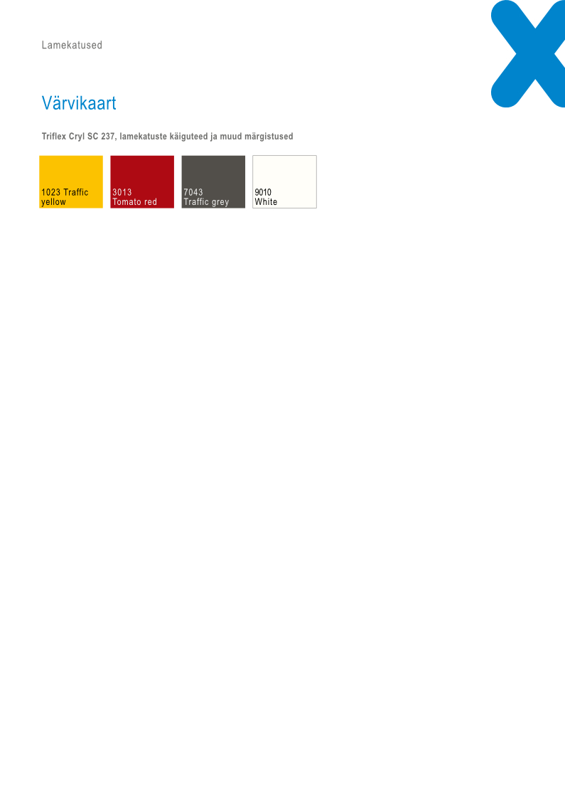 Hüdroisolatsiooni toon on RAL7032. Pealmiseks kihiks paigaldame ühtlase ja sileda värvkatte. Värvkate on vajalik ainult siis, kui soovitakse hüdroisolatsiooni tooni muuta. Katuse pinnal kaiguteede märgistamisel ja karestamisel kasutataval vedelplastil Triflex Cyl SC 237 on 4 erinevat tooni.