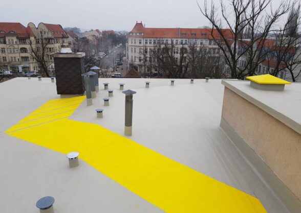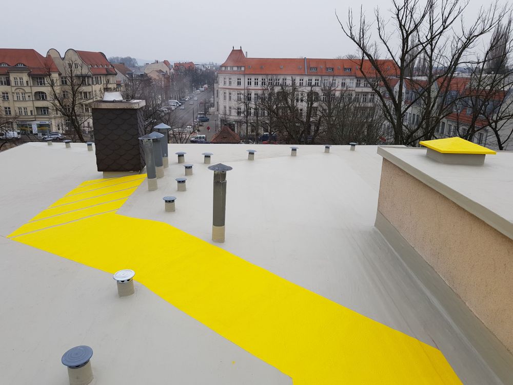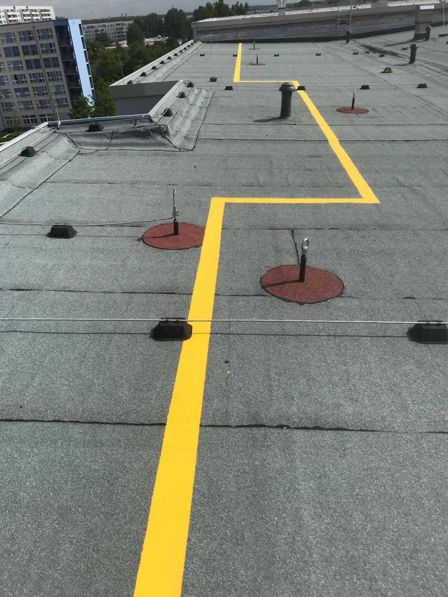 Katusel liikumise ohutus peab olema iseenesest mõistetavalt tagatud. Katusele paigaldame katusepollarid, mille külge on ennast võimalik turvaköie abil hooldustööde ajal kinnitada. Täiendavalt mehaanilisele kinnitusele paigaldame hüdroisolatsiooni peale kareda struktuuriga ja erineva tooniga hooldusteid, et jalg ei libiseks ning märgistame katuse ohutsoonid. Materjalina kasutame Triflex Cryl SC 237 vedelplasti.